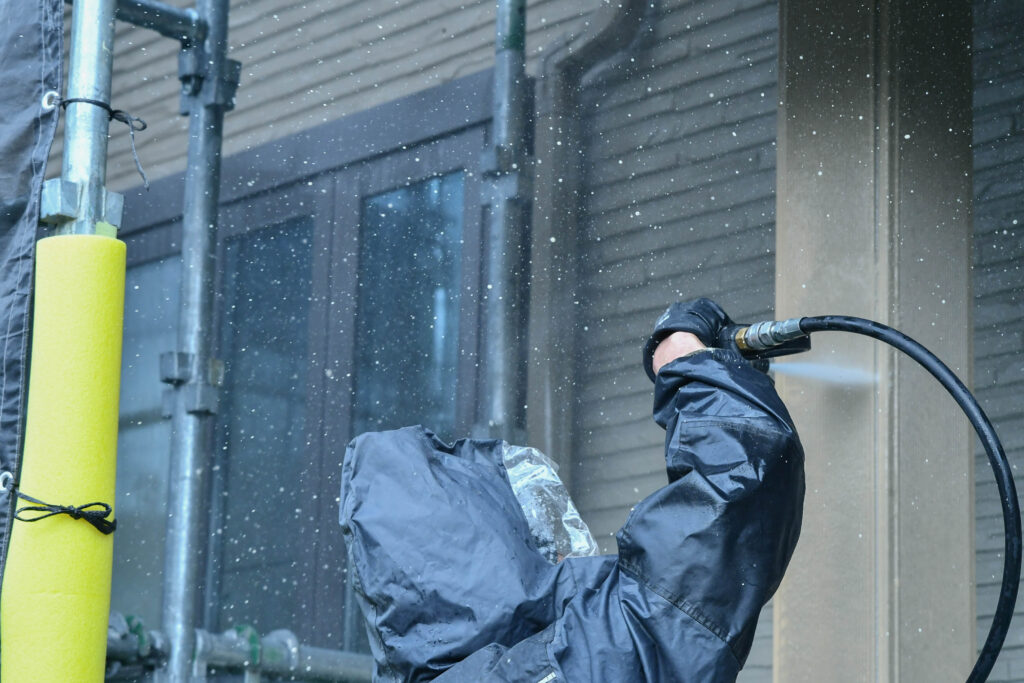 足場を組み、養生を施して、洗浄がスタート。