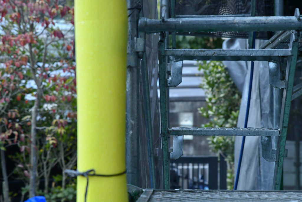 雪が降りそうな寒さのこの日は、外壁を高圧洗浄する作業が行われていました。
